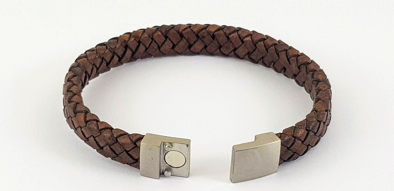 Buy online Luxury Brown woven flat leather 10 mm wide X 5 mm thick bracelet. Our leather bracelets are handmade in the UK by us on site using high quality leather & cords and hand-finished with a silver clasp for easy opening and closing.